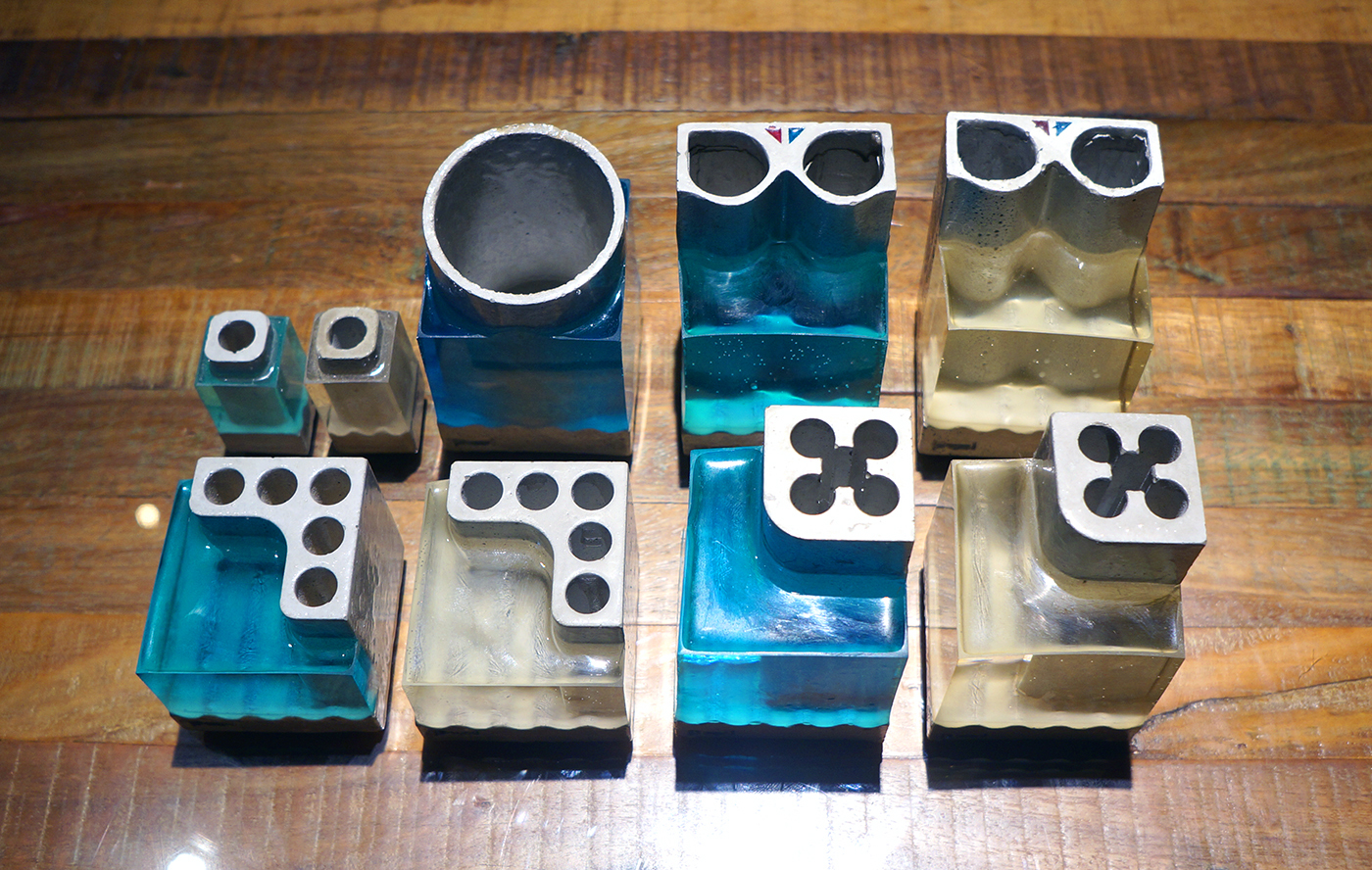 グレーのコンクリートをベースに透明のブルーとクリア2色のシンプルな色合いのPoolは自宅、オフィスにどの環境にも溶け込むデザインです。