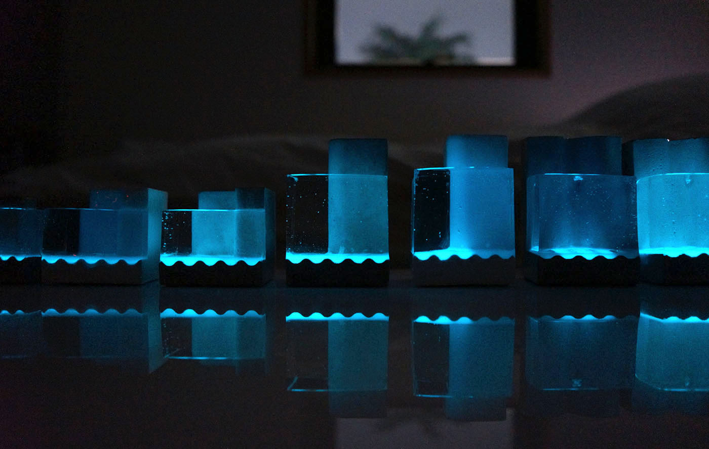 Poolの大きな特長として、発光樹脂の底面流し込む事で発光を可能にしました。日中に光を貯めて夜になるとぼんやり青く発光するPoolは幻想的でとても綺麗です。Poolを製作を始める時に一番表現したい事それは夜中に忍び込んだ“夜のプール”のイメージです。