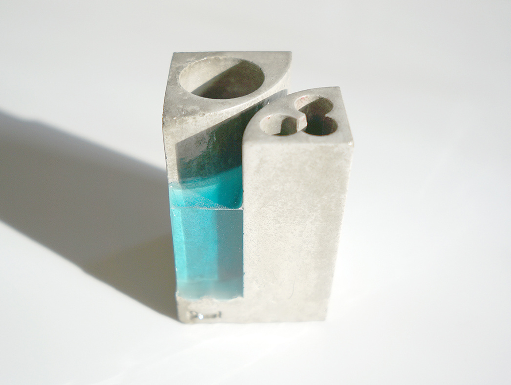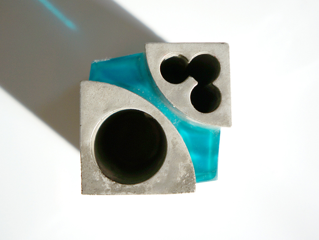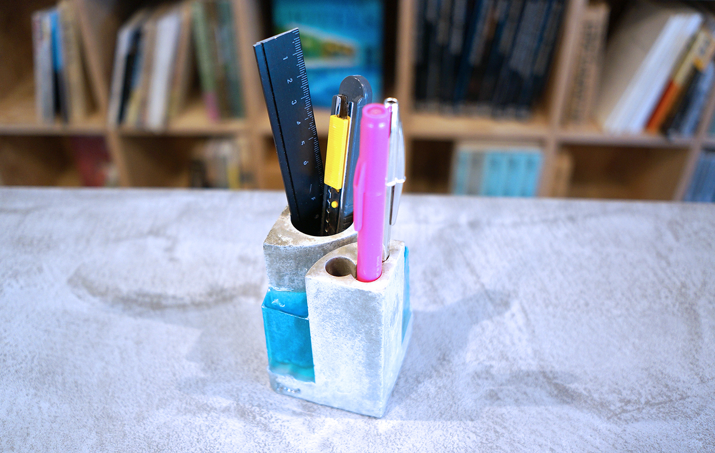 ペンスタンドPoolで初めての2種類の挿入口を採用しました。一つは3本入りのペン用挿入口。もう一つは大抵のものが挿入できる直径30mmの文房具の挿入口です。2つ対角に並んでいます。