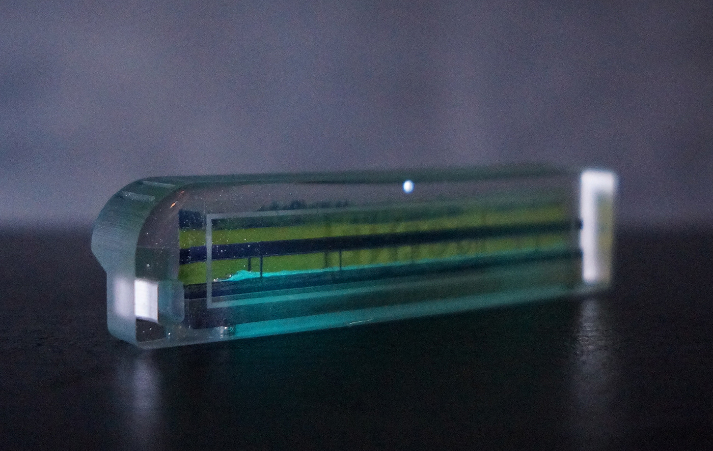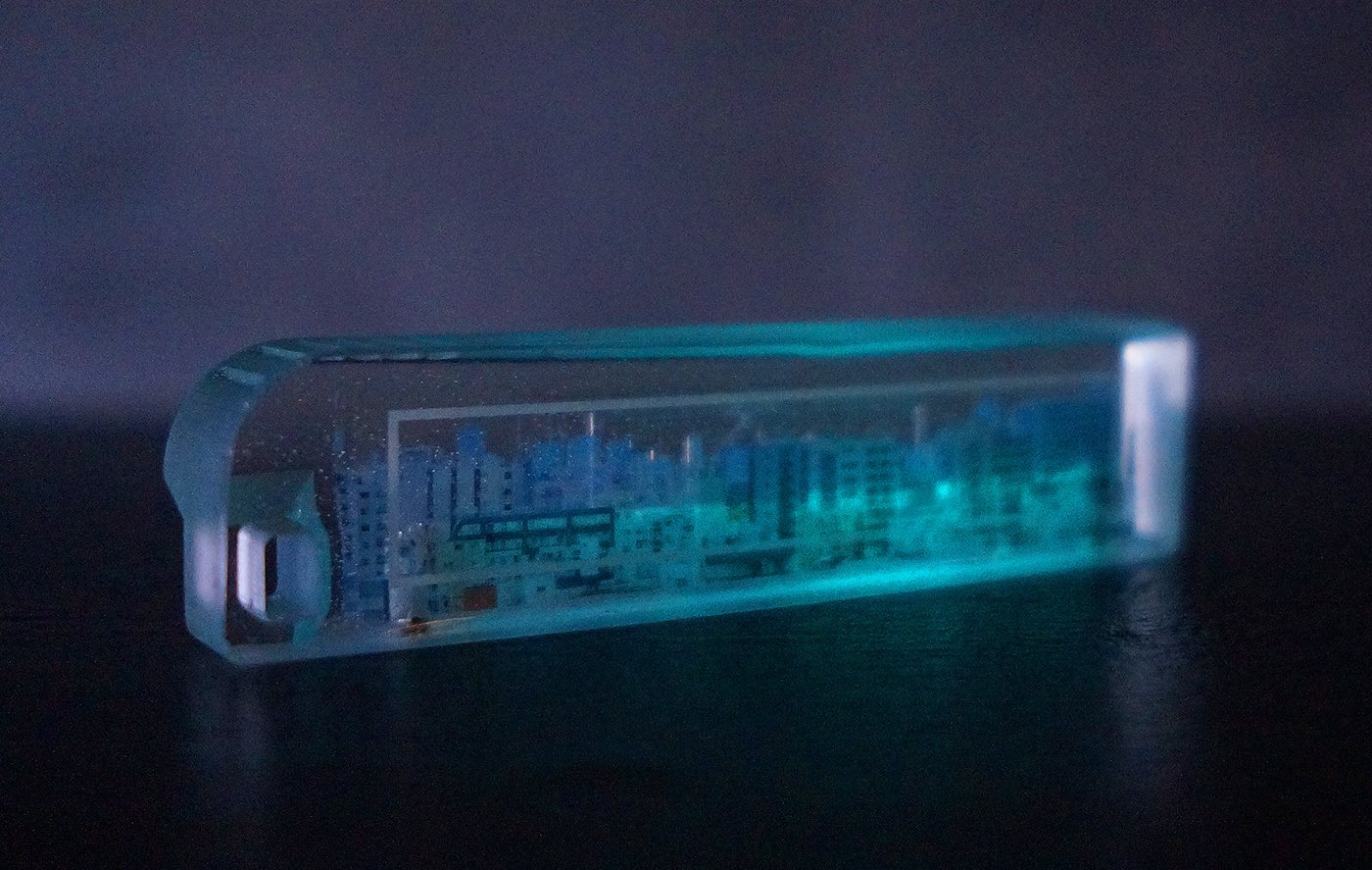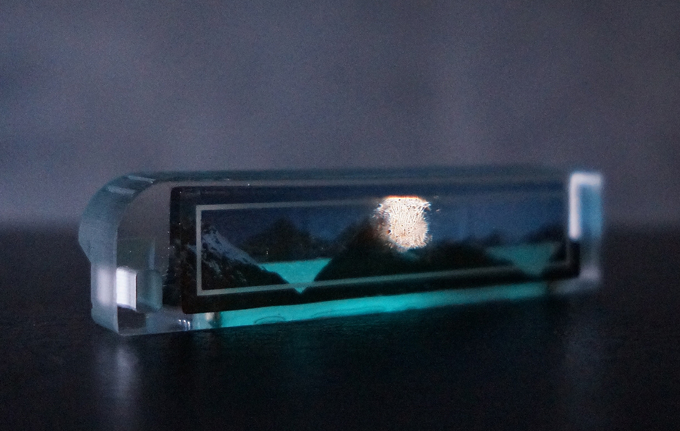 フィルムとフィルムの間の下部の横長の深い溝を作り蓄光塗料を流し込みました。フィルムとフィルムの間で輝きますのでより幻想的な表現が可能になりました。City・Sunset・Road・Mountainに共通しているのは、遠く先になにかが見えるような“水平線“をイメージしています。