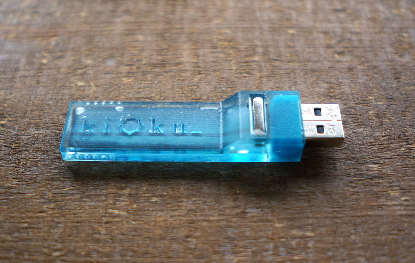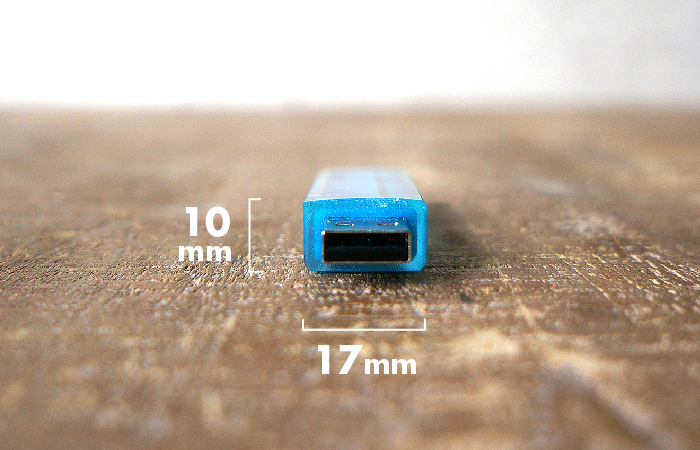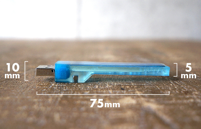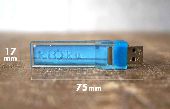 先端が10mmと厚く、後端が半分の5mmと細くなっています。以前から市販のUSB memoryを使用しながら「このような形状のものはないものか?」と思い製作した使いやすさを考えた独特のデザインです。裏面にはkioku_ロゴの刻印が刻まれています。