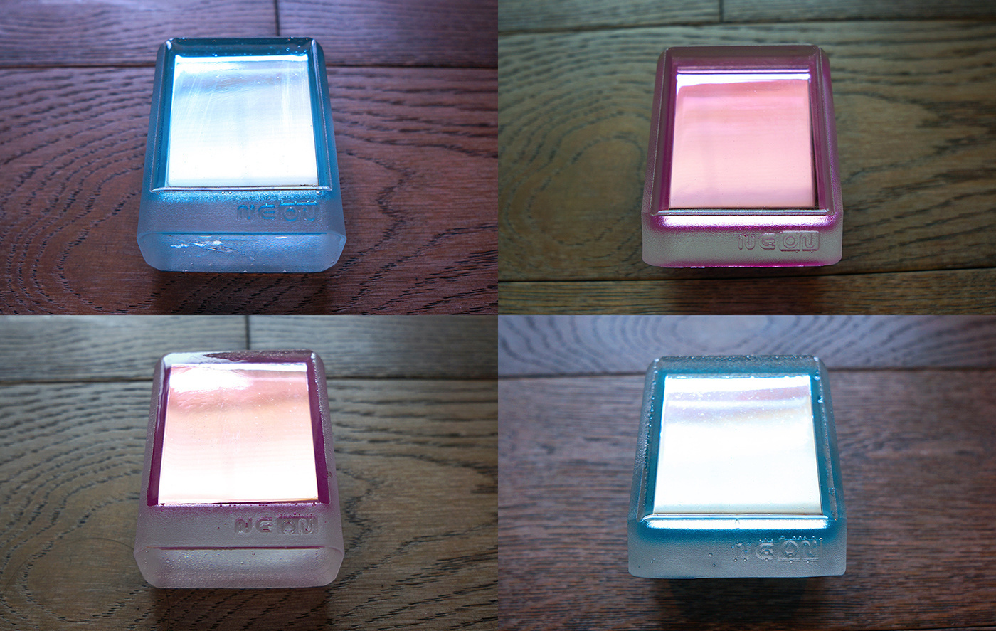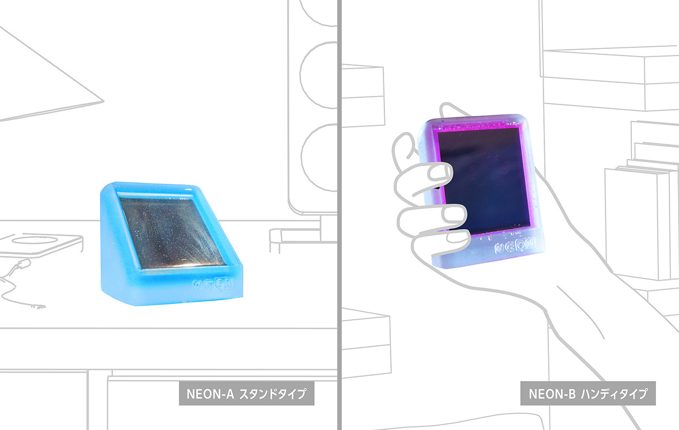 NEONはデスク等に “置いて” 使用する斜め45度に傾いているNEON-Aと “手持ち” で使用するNEON-Bの2種類があります。またネオン灯のように発色するブルーとピンクの2種類。あなたの用途に合わせてご検討ください。