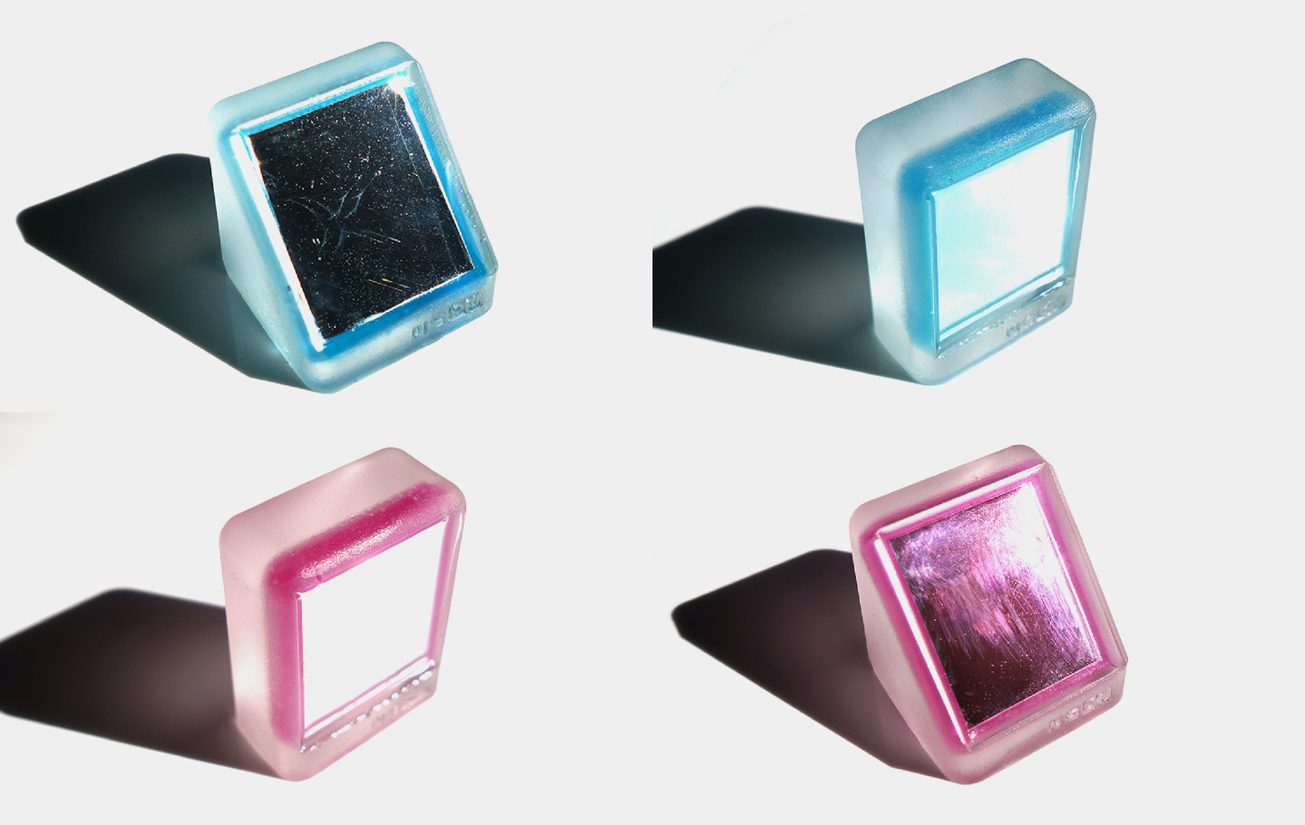 まるで夢の中にいるようなオリジナルペイントミラー“NEON“。半透明のボディの中に鏡を埋め込みました。NEON-A[ブルー/ピンク]はデスクに置いて下から覗き見やすいよう斜め45度に鏡を埋め込んでいます。