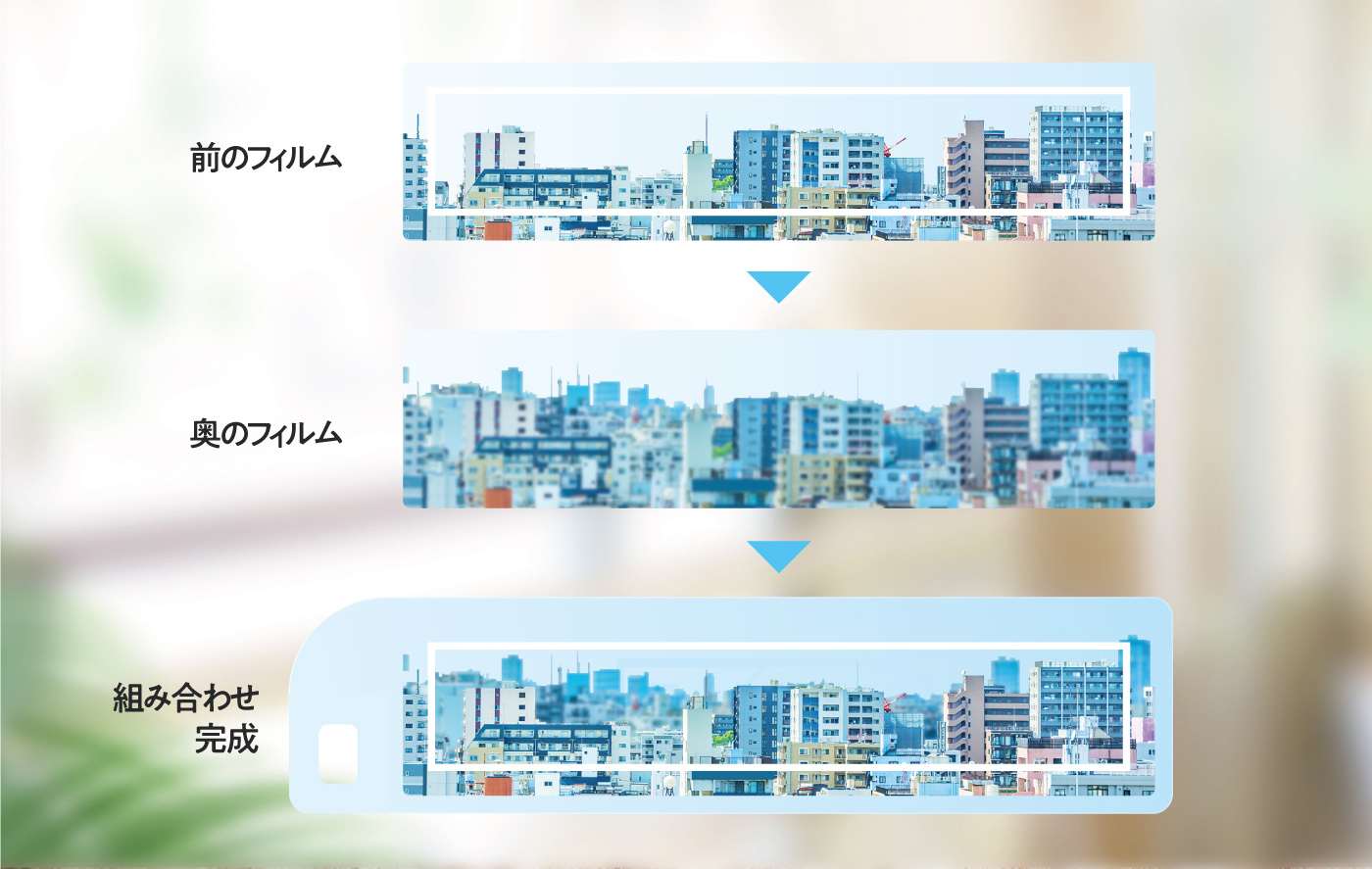 SCENEの大きな特徴として2枚の写真フィルムを前方と後方に2枚重ねる事により立体的な表現をしています。重ねた写真の距離感や透明度など数十回サンプルを製作しSCENEが完成しました。