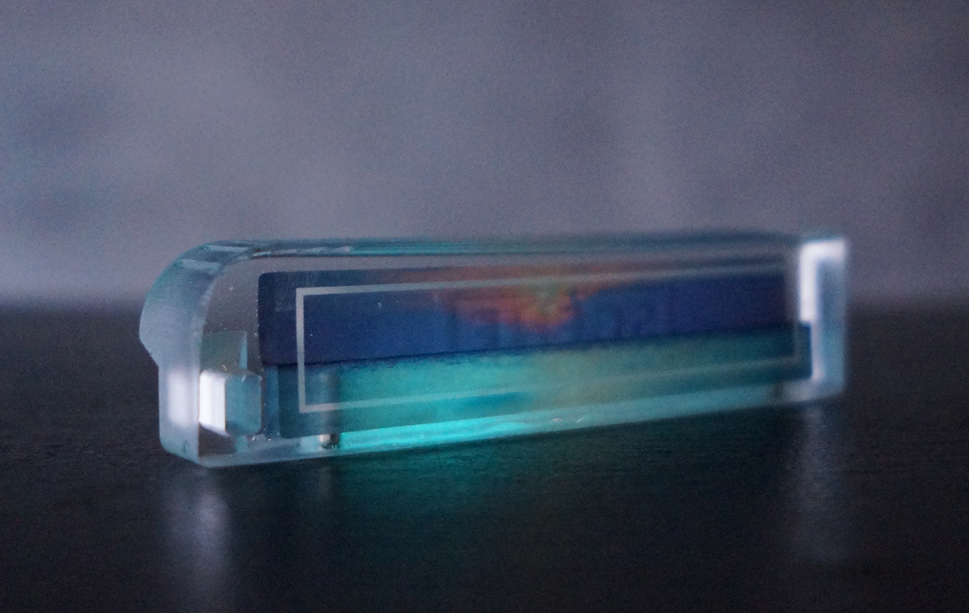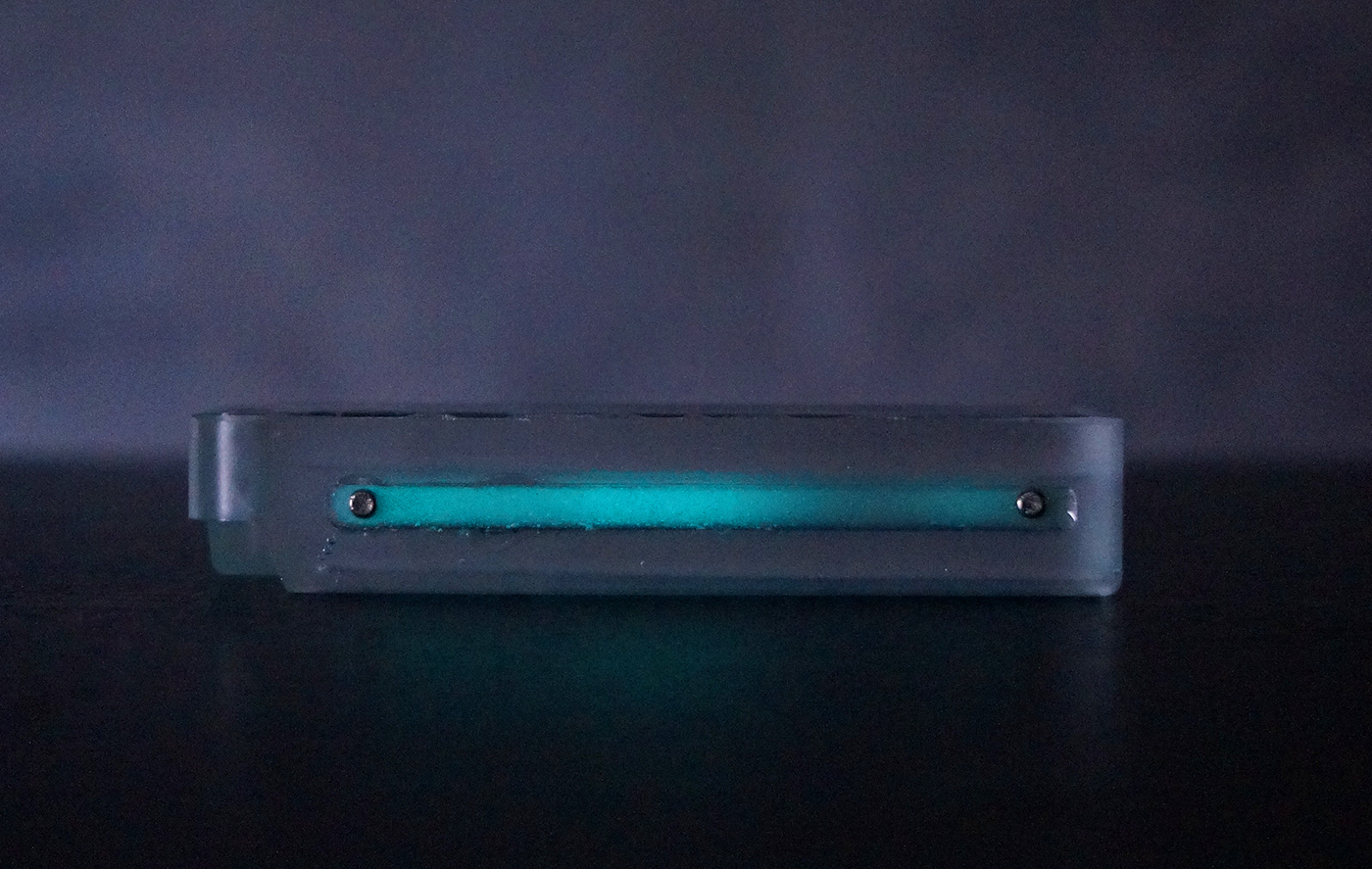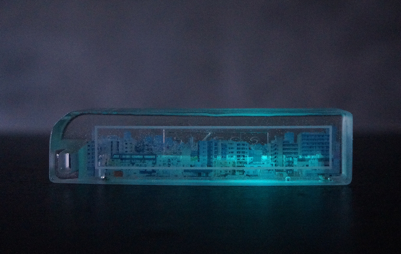 フィルムとフィルムの間の下部の横長の深い溝を作り蓄光塗料を流し込みました。フィルムとフィルムの間で輝きますのでより幻想的な表現が可能になりました。City・Sunset・Road・Mountainに共通しているのは、遠く先になにかが見えるような“水平線“をイメージしています。