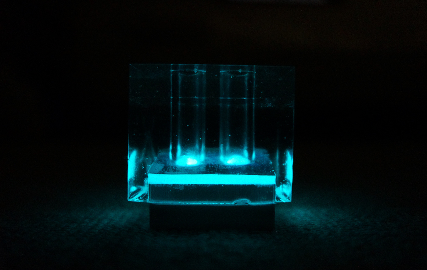 自然空間を切り出したCube Stand ”HOKOSORA” 箱空。夜になっても自然を表現しています。フィルムの下に光を蓄積して、暗闇で発光する溜光塗料を土台としています。あなたの身近に夜の自然を置いてみてはいかがでしょうか?