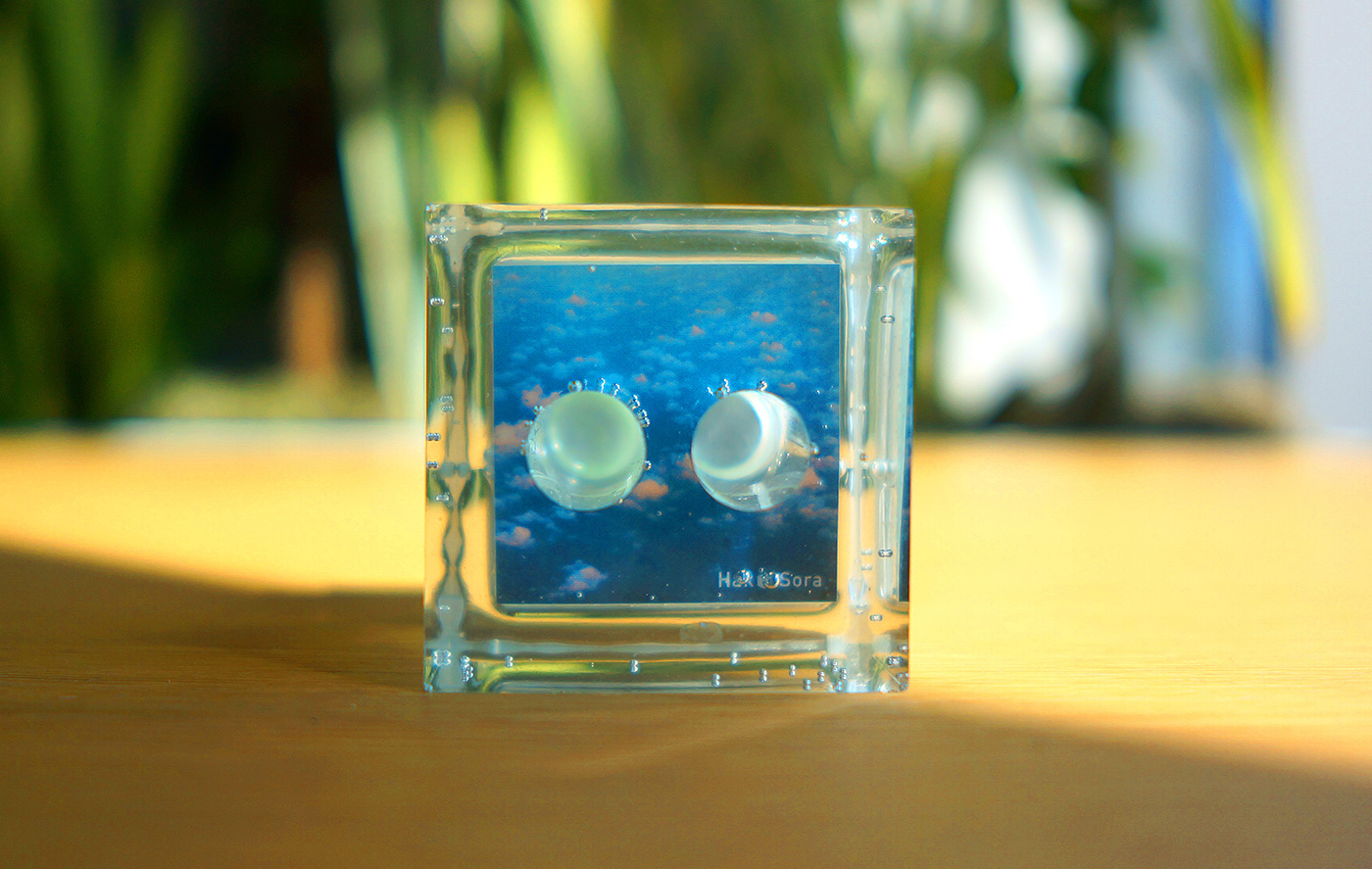 50mmの立方体の中に自然の空間を表現したCube Stand ”HAKOSORA”。オブジェながらペンスタンドとしても使用していただけます。遥か上空。雲より上を飛んでいるような 〜空〜。