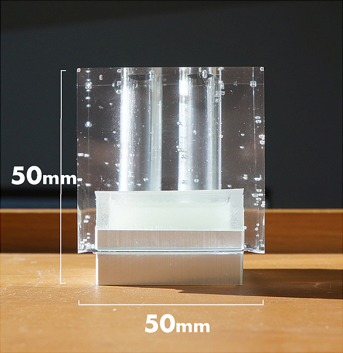 50mmの立方体に壮大な自然の埋め込みました。小さく場所をとらないので、自宅はもちろんスペースの小さい職場に置いてもらえるとストレス解消になります。
