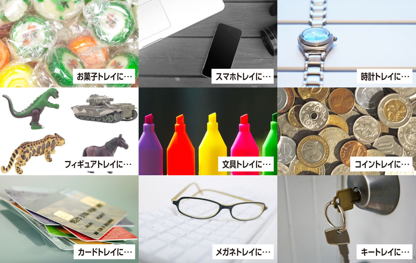 midori”は様々な用途にご利用いただけます。ご自宅では玄関横に鍵・時計トレイ、オフィスでは文具トレイ・スマホスタンド。またお店レジのお菓子・コイントレイなど様々な用途でご利用いただいております。