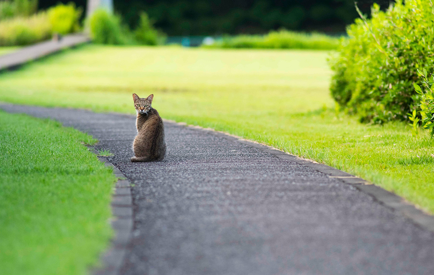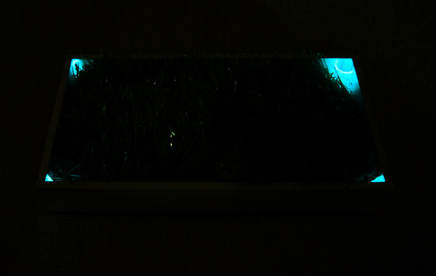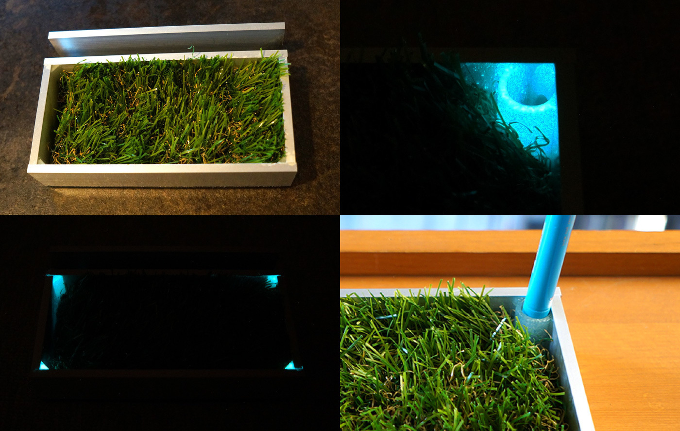 芝生の四隅に光を溜めて発光する溜光塗料を埋め込みました。暗闇で芝生の中でぼんやりと光る光景は幻想的です。