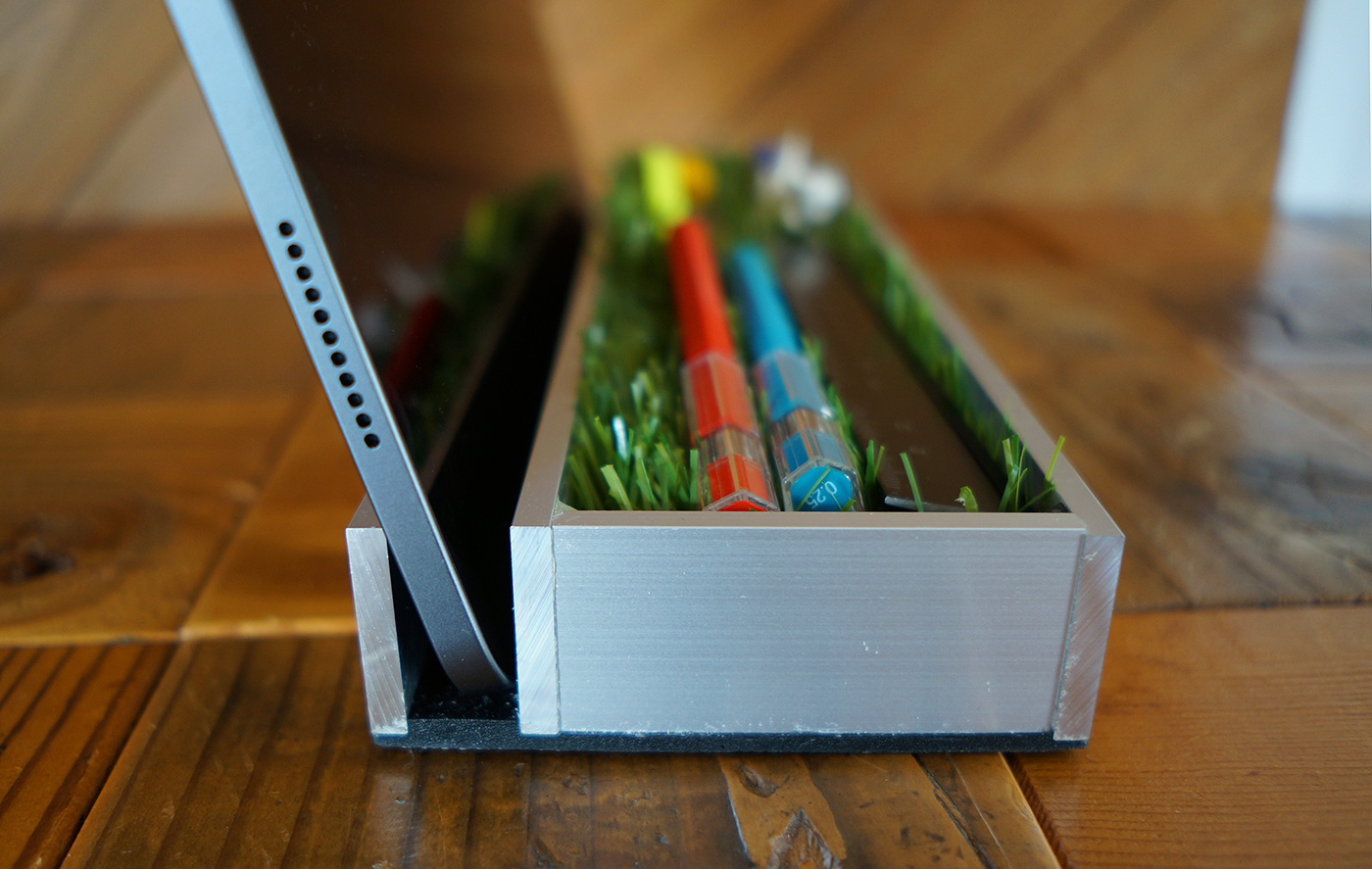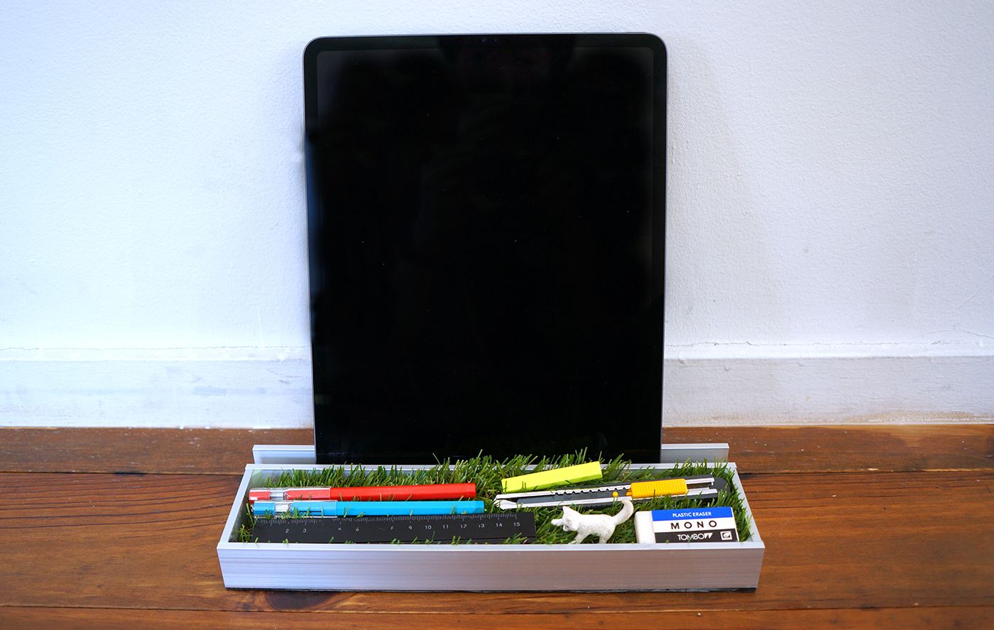 横幅が300mmあるmidori-MC。長い芝生の上にペンや定規など長いものを複数置く事ができます。そして奥に同じ長さの溝があり、名刺やスマホ、タブレットなど複数置くことができます。