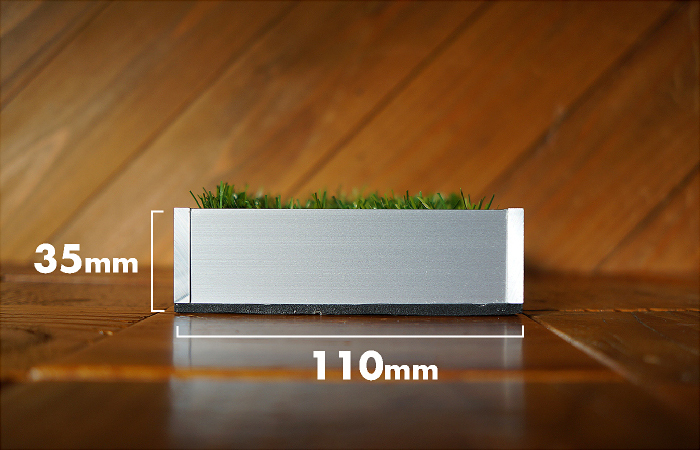 厚さ5mmのアルマイト処理をした高級アルミの存在感のあるmidori Mシリーズ。芝生の四角に溜光塗料が塗ってあり暗闇で発光します。midori-MA/Bにはペン挿入口、midori-MC/Dの溝を利用してスマホ等を置く事ができます。
