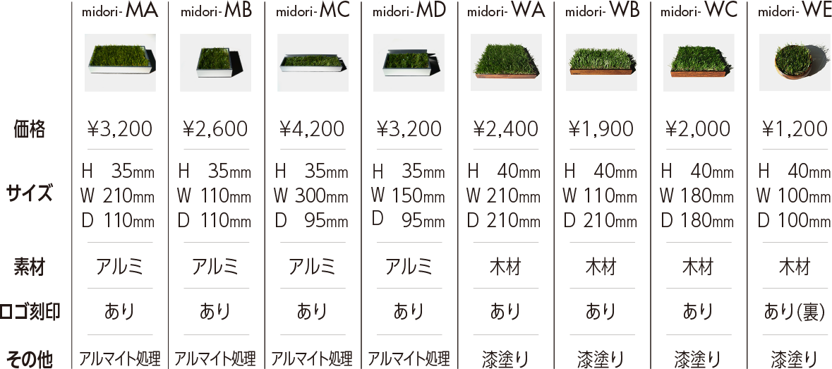 midoriの種類はメタル(アルミ)ベースとウッド(漆塗り木材)の2カテゴリーあり、メタルは4種類、ウッドは4種類合計8製品あります。用途に合わせてご利用ください。