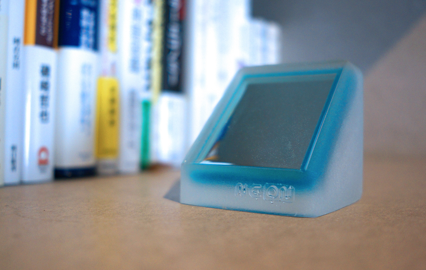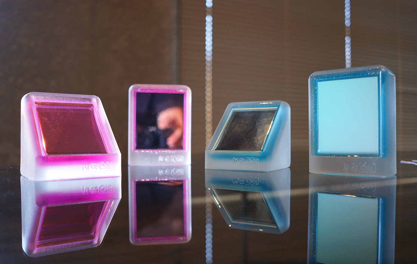 まるで夢の中にいるようなオリジナルペイントミラー“NEON“。半透明のボディの中に鏡を埋め込みました。NEON-A[ブルー/ピンク]はデスクに置いて下から覗き見やすいよう斜め45度に鏡を埋め込んでいます。