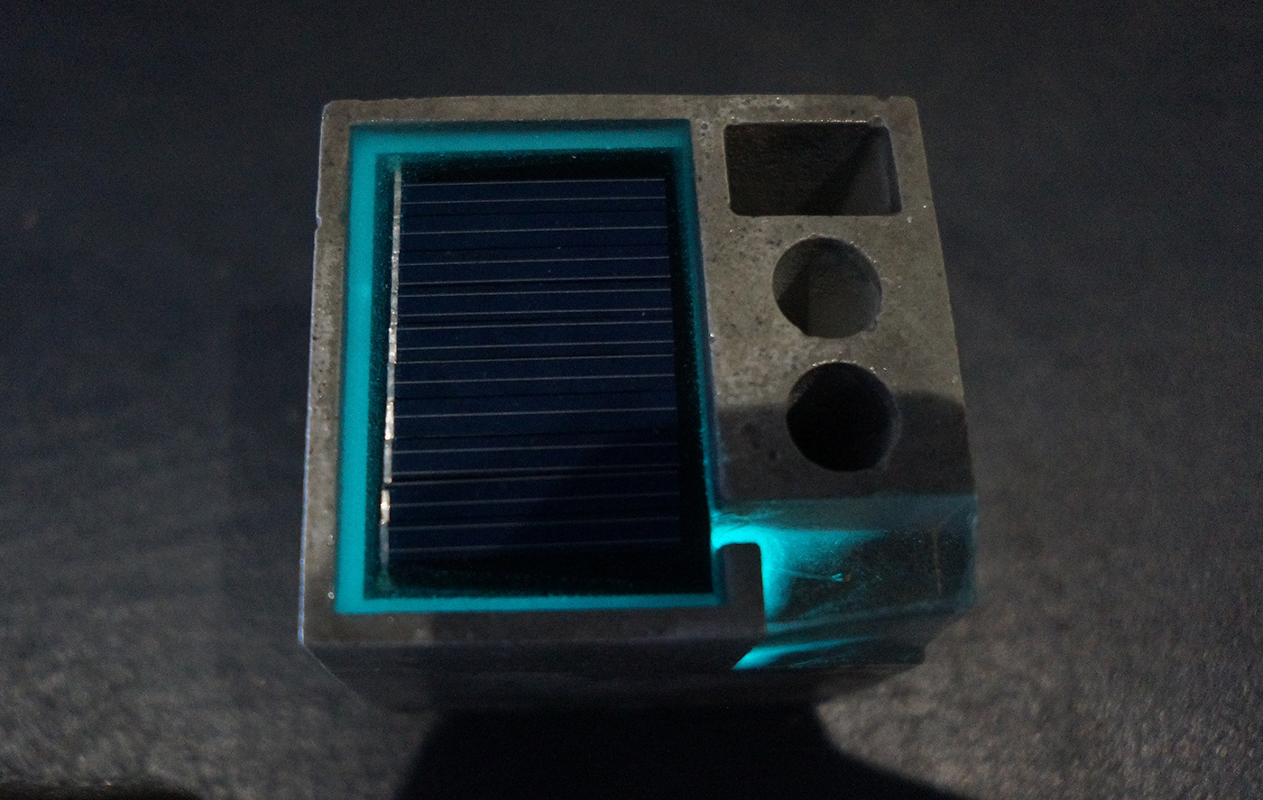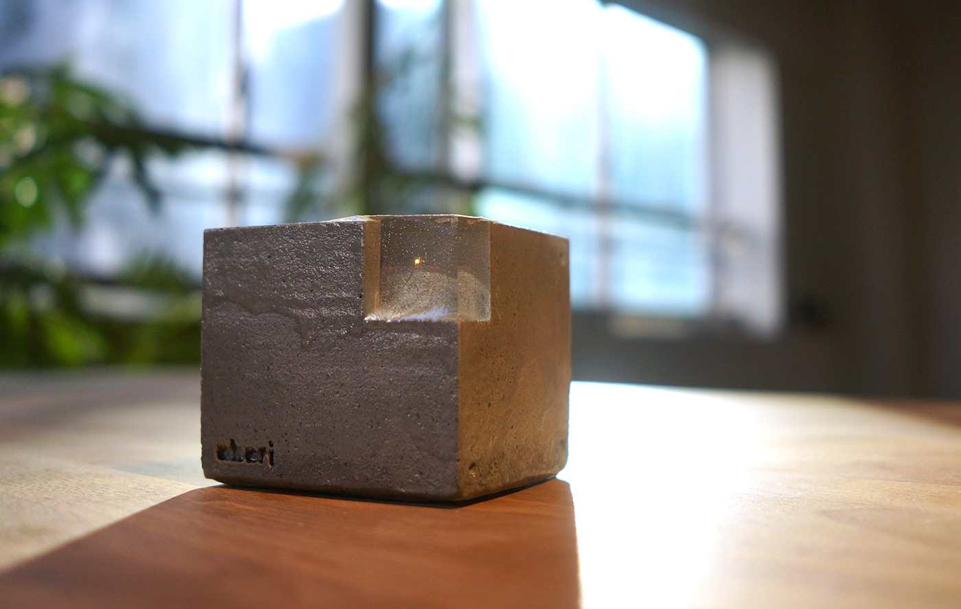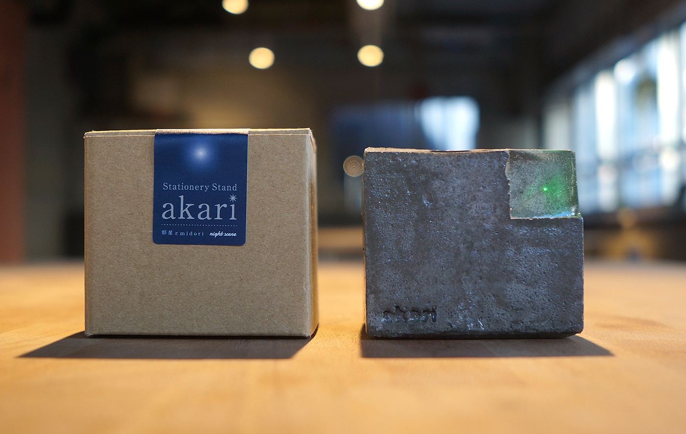 小さな家のような立方体の中に一粒のLEDライトが淡い灯りであなたの心を照らします。光パネル使用しているので電池は必要はありません。akari02は右上の小さいスペースにLEDを埋め込みました。実際のコンクリート住宅のミニチュアのような雰囲気です