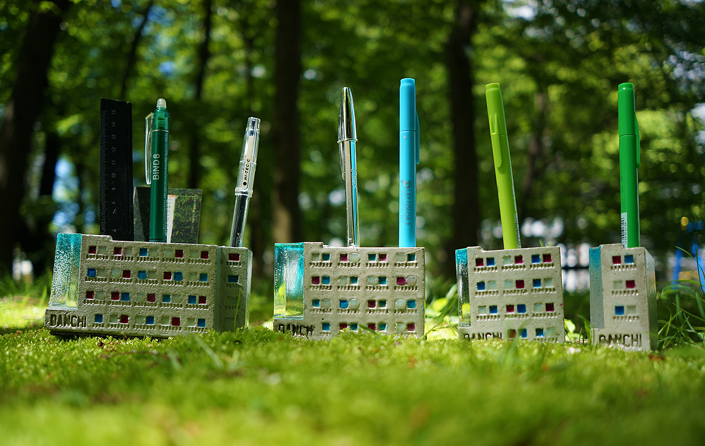 “DANCHI”にはペン、カッター又名刺やカードを挿入できるスタンドが屋上(上部)に装備しています。A棟〜D棟。大きさ/数が異なりますのであなたの用途に合わせてお選びください。