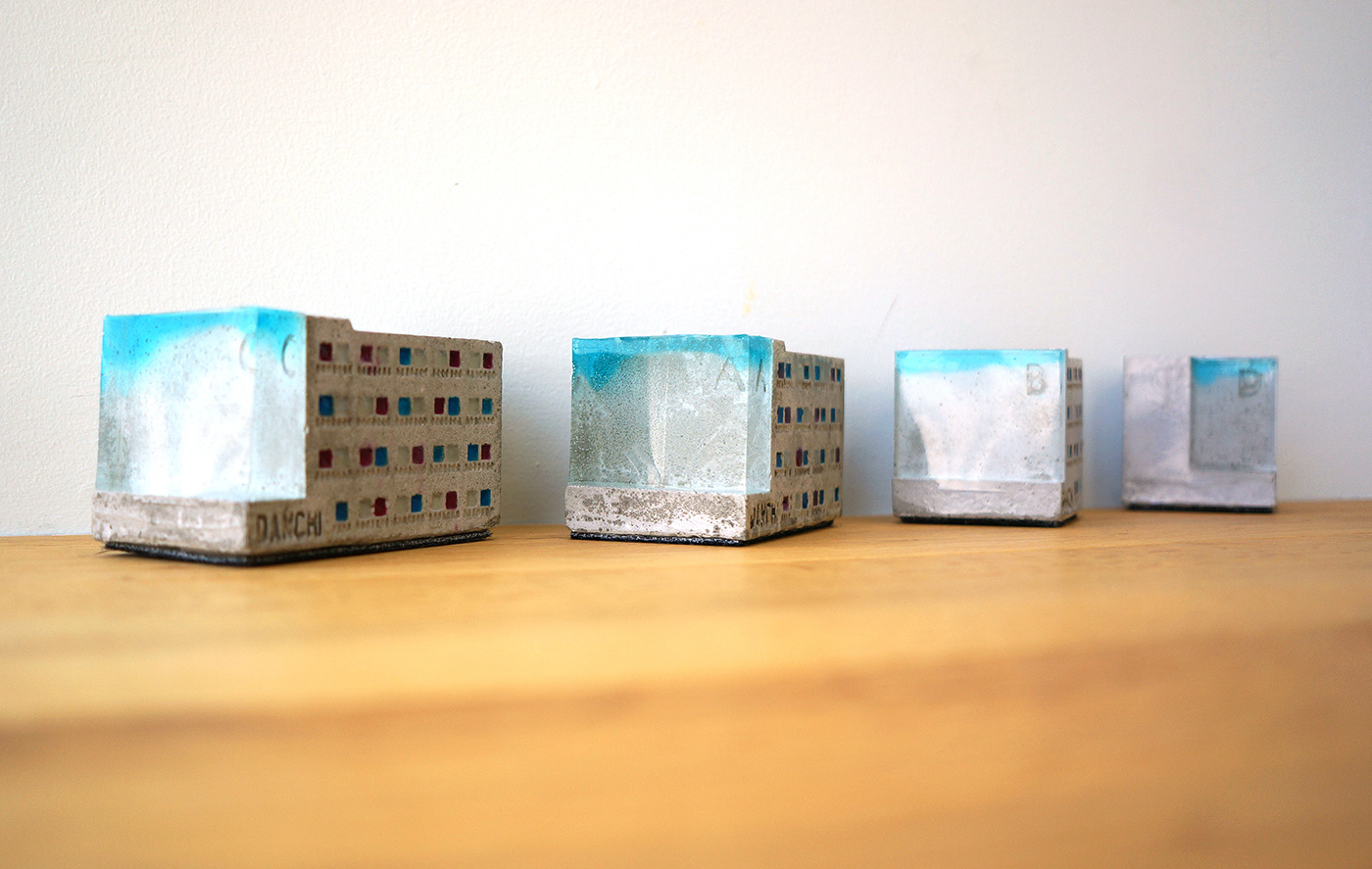 “DANCHI”には青空が良く似合います。A棟〜D棟の左側にそれぞれ大きさの違う小さな庭があります。上部は薄い水色で地面に近づくによって透明でほのぼのとした団地を表現しました。