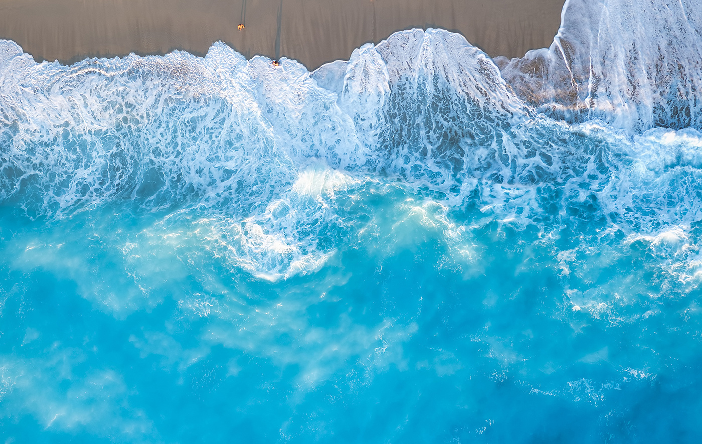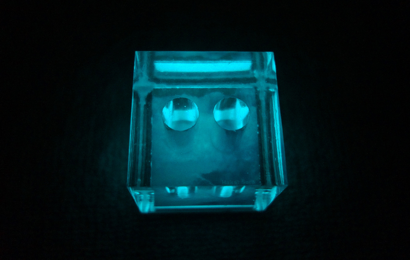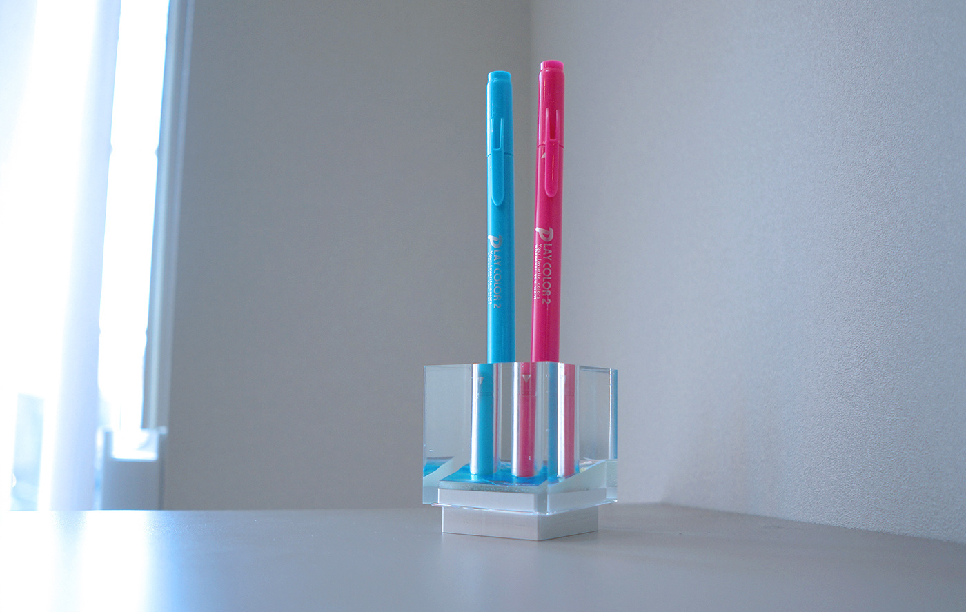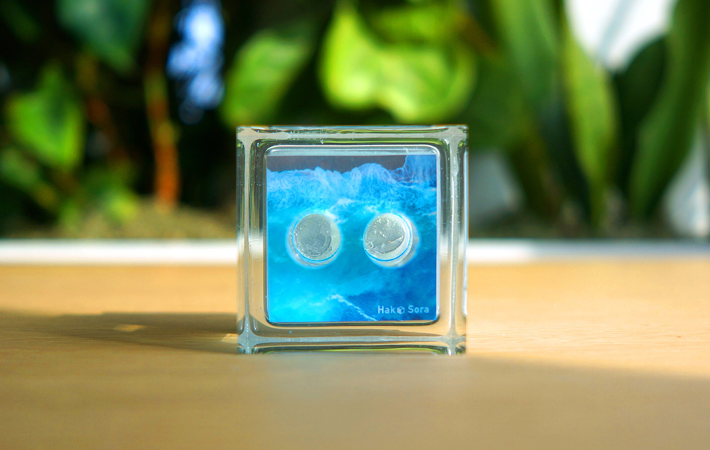 50mmの立方体に自然の空間を表現したCube Stand ”HOKOSORA”。オブジェながらペンスタンドとしても使用していただけます。鮮やかな青。見てるいだけで気持ちが静まる。〜海〜
