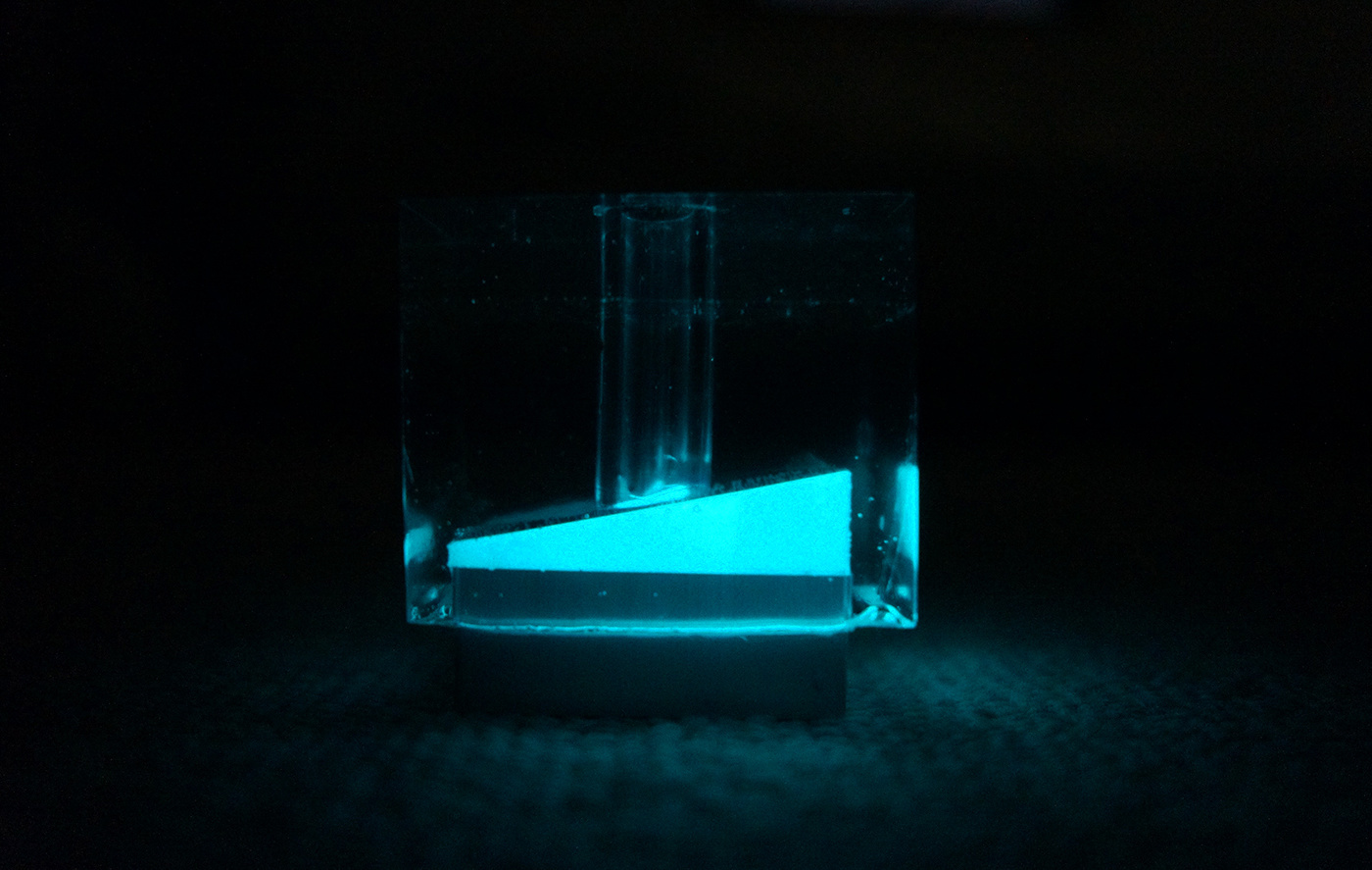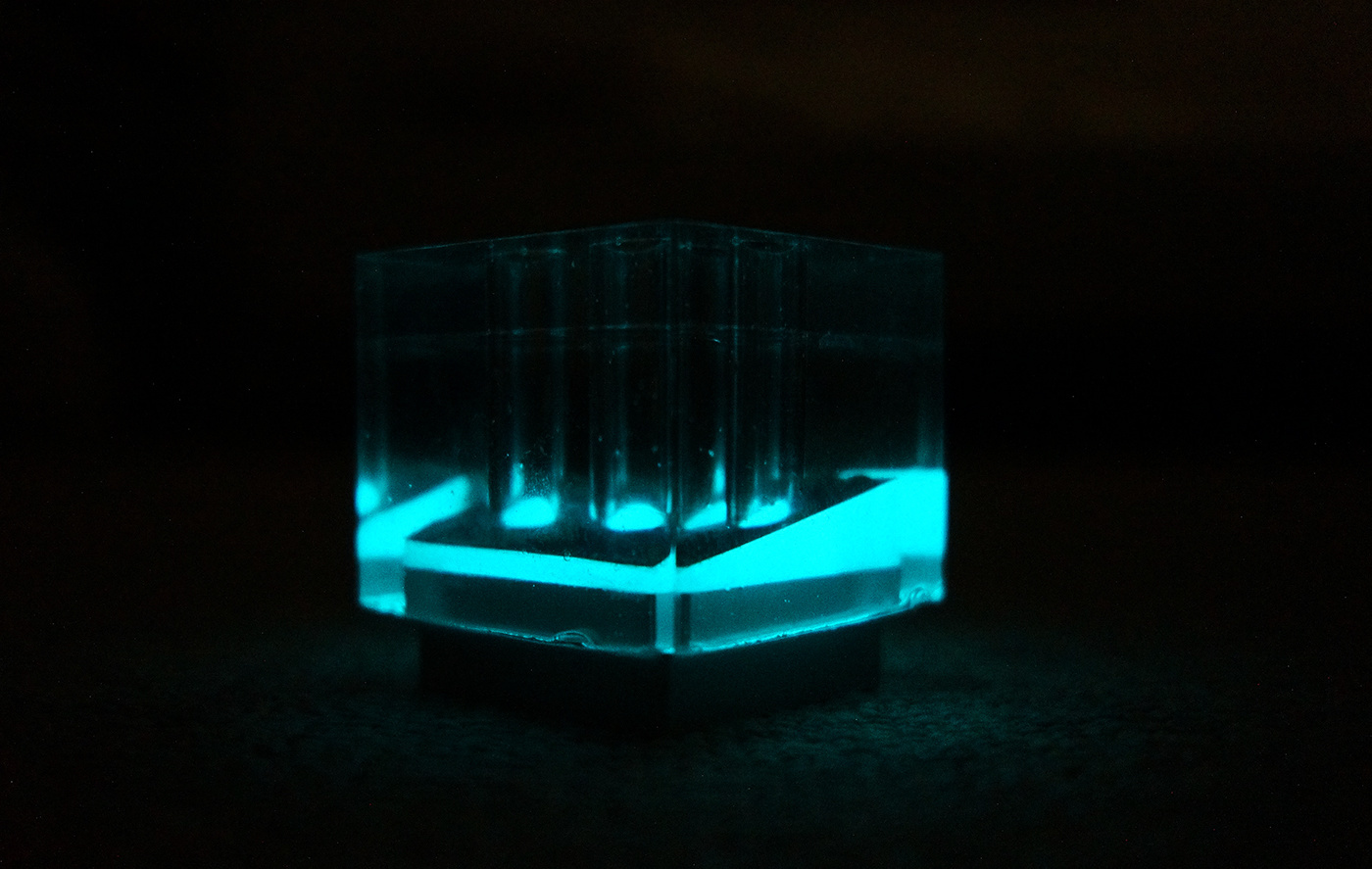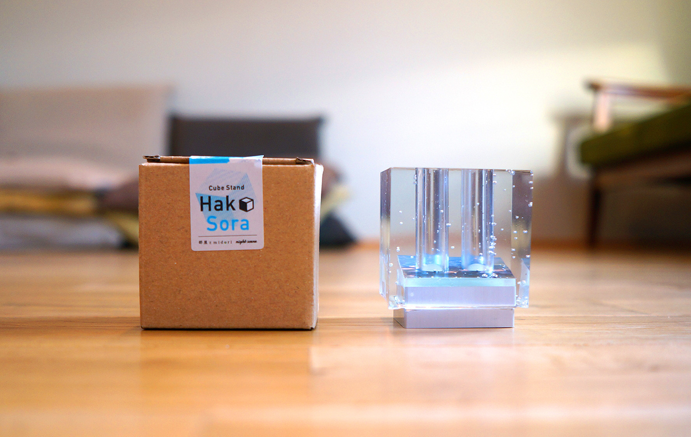 自然空間を切り出したCube Stand ”HOKOSORA” 箱空。夜になっても自然を表現しています。フィルムの下に光を蓄積して、暗闇で発光する溜光塗料を土台としています。あなたの身近に夜の自然を置いてみてはいかがでしょうか?