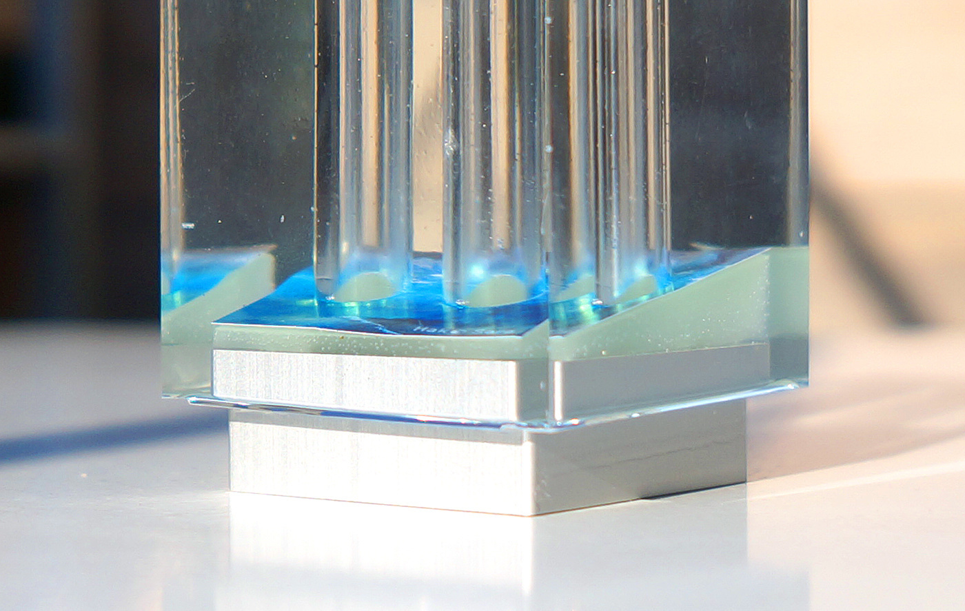 下部の土台として厚み15mmのアルミ台。厚くすることで重たくなり安定しました。何パターンか試作して一番丁度良い重さになりました。