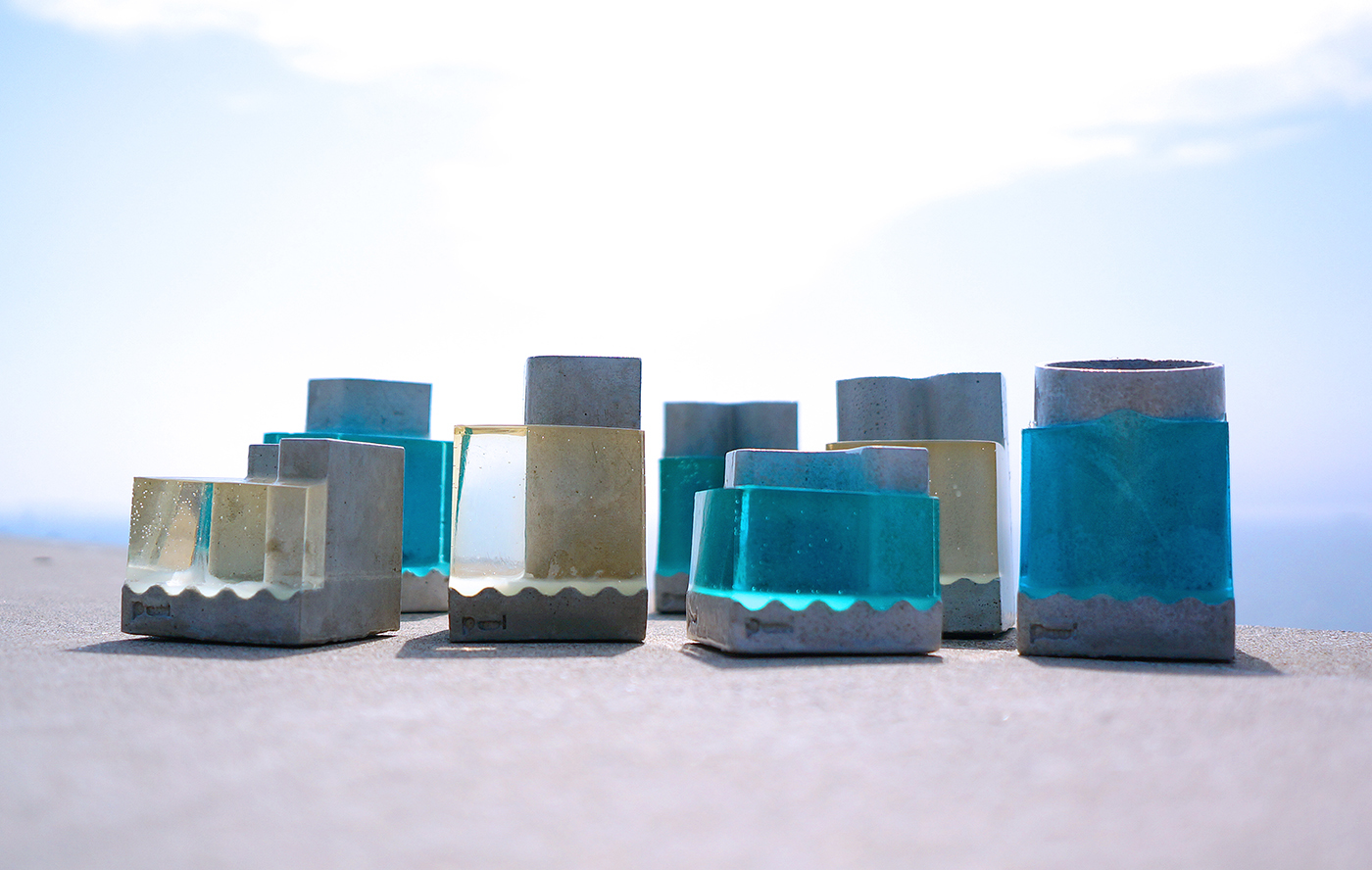 グレーのコンクリートをベースに透明のブルーとクリア2色のシンプルな色合いのPoolは自宅、オフィスにどの環境にも溶け込むデザインです。