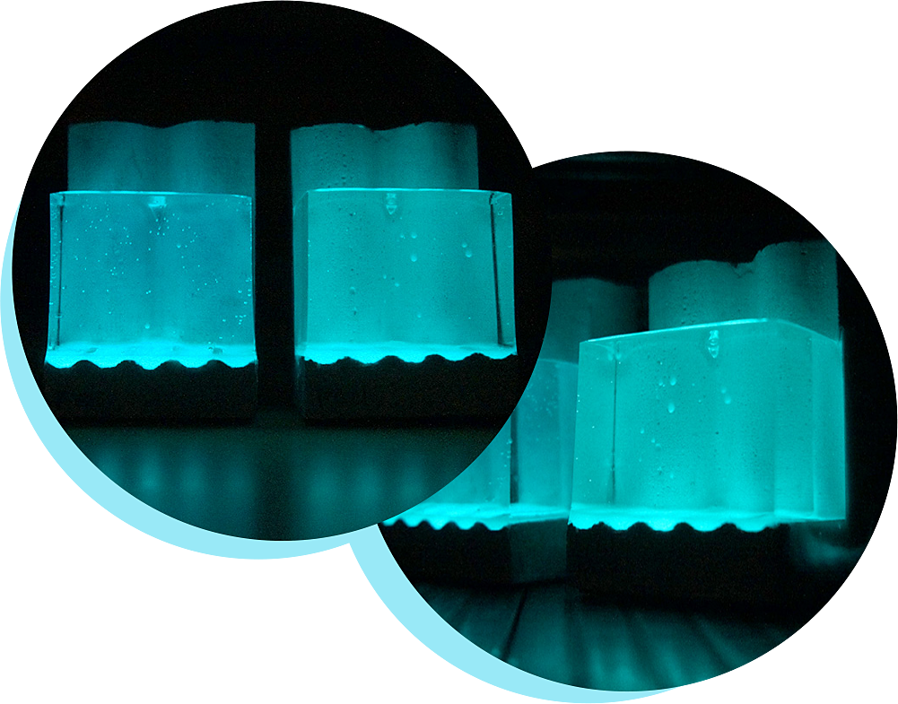 Poolの最大の特徴をして夜になると青白く発光する発光塗料を水底に沈んでいます。洗面台で青白く光るシルエットはとても美しい佇まいです。