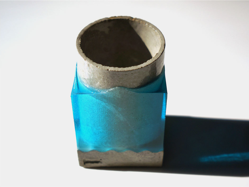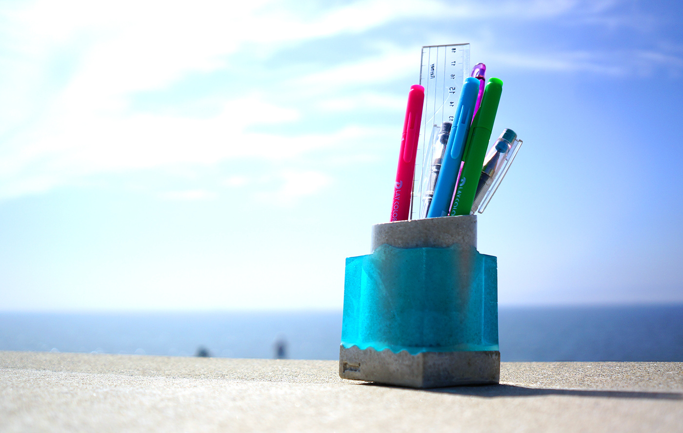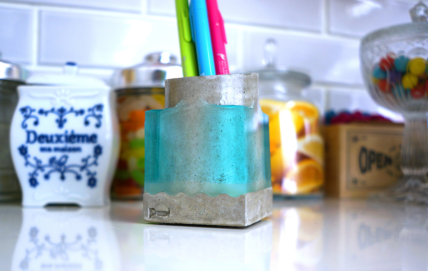 “Pool-E”は癒しのオブジェPoolの良さを残しながらいままでの1本差ししかできなかった“Pool”に直径50mmで多数挿入ようにしました。また正面から斜め10度の切り込みを入れ、ペンやハサミなどの挿入物の取り出しも容易にしました。オブジェとしても美しいシルエットです。