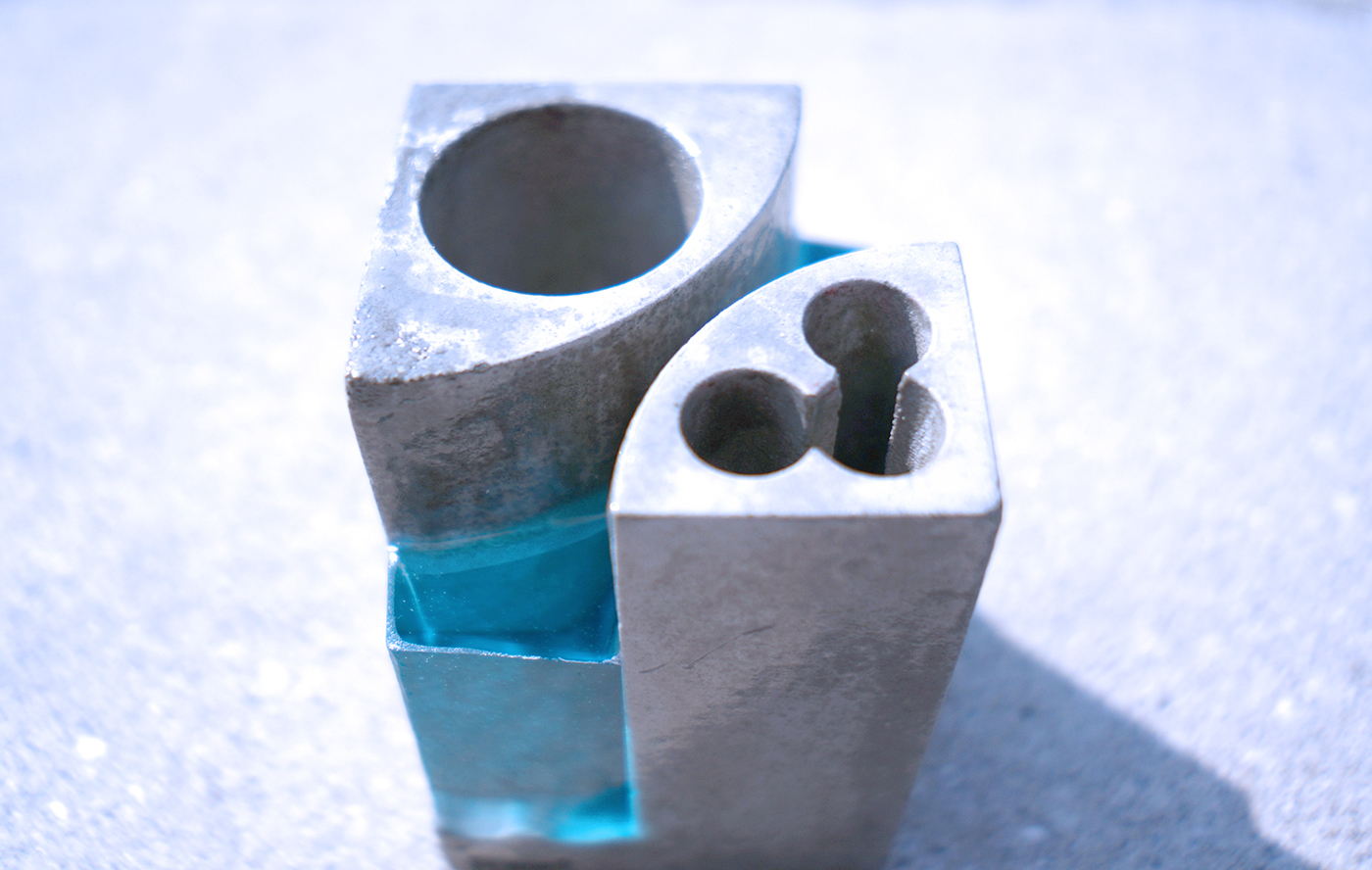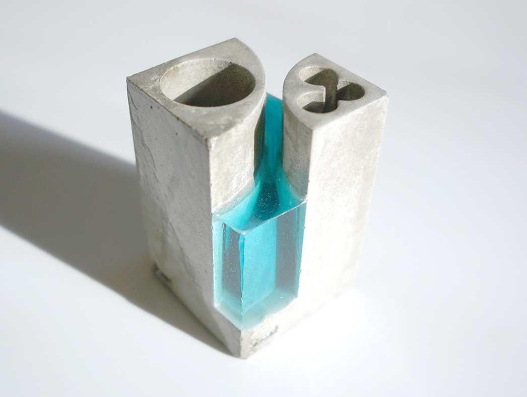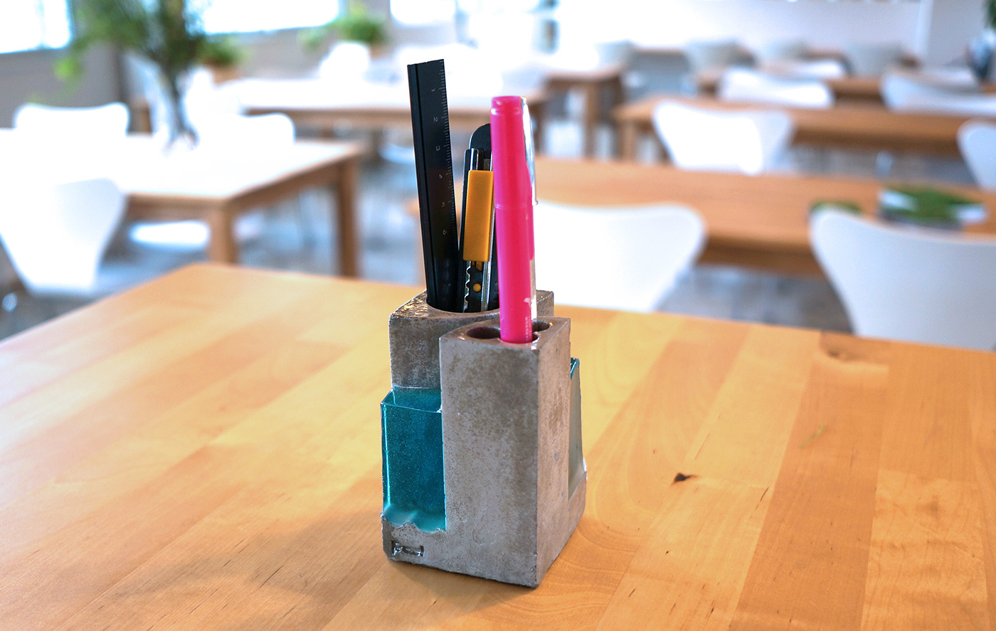 ペンスタンドPoolで初めての2種類の挿入口を採用しました。一つは3本入りのペン用挿入口。もう一つは大抵のものが挿入できる直径30mmの文房具の挿入口です。2つ対角に並んでいます。