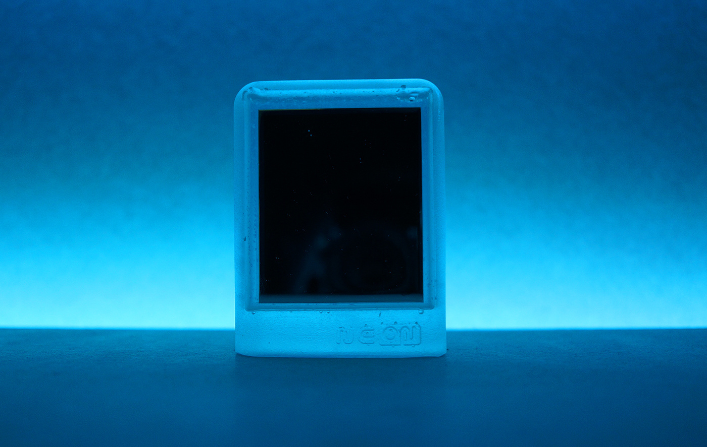 鏡を照らすネオン灯をイメージした“NEON“。半透明のボディの中に鏡を埋め込みました。NEON-B[ブルー/ピンク]は鏡面以外の部分は半透明のエンボス加工で手持ちが使いやすくなっています。